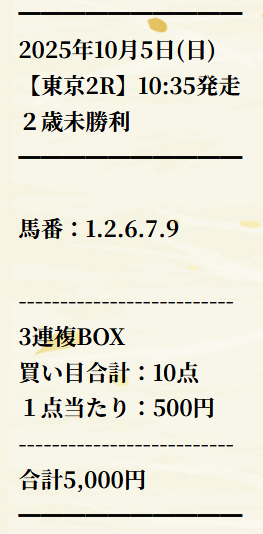 5日(日)は東京2Rを三連複的中で1万2950円